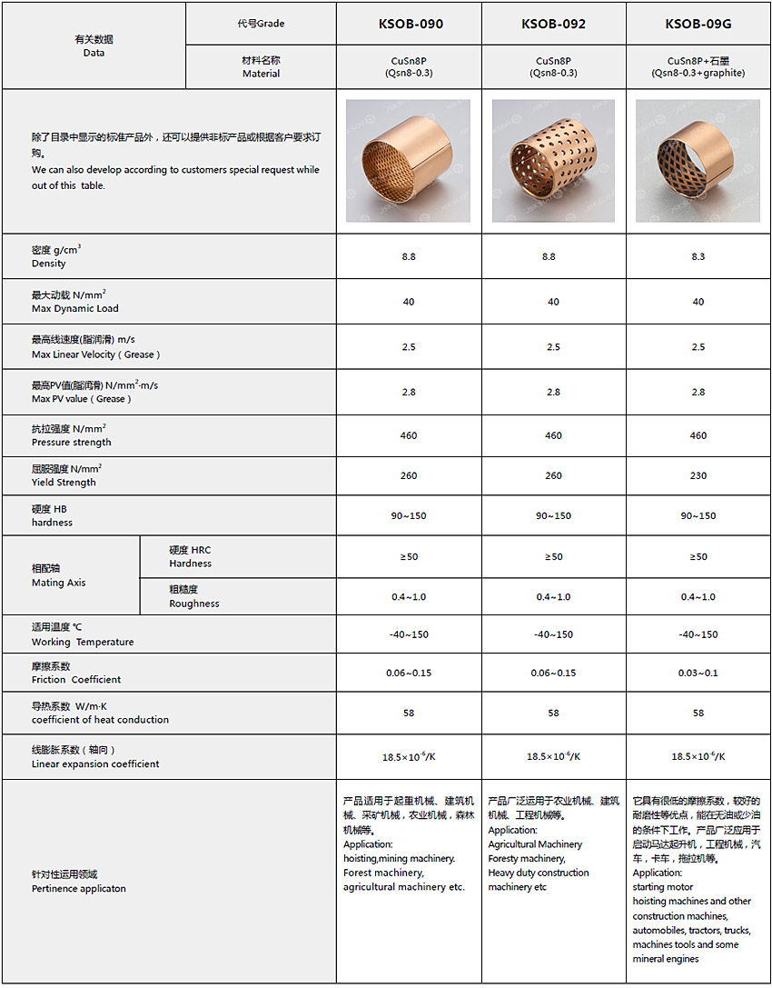 The bearing is made with CuSn8 bronze alloy which is featured with high load capacity and good anti-wearing characteristics.The diamond shape indents on the surface of the bearing serve as oil reservoir to generate oil film for the lubricating during the initial running. The bearings are mainly suitable for agriculture machineries and construction machineries applications.